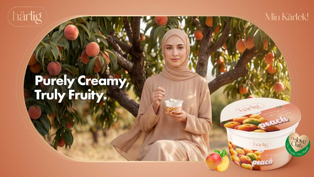 With the first taste of Harlig Greek Peach Yogurt she is gently carried from her lounge into a sunlit peach orchard. Beneath ripened branches on a wooden bench surrounded by warm light she holds her cup and feels the world soften.